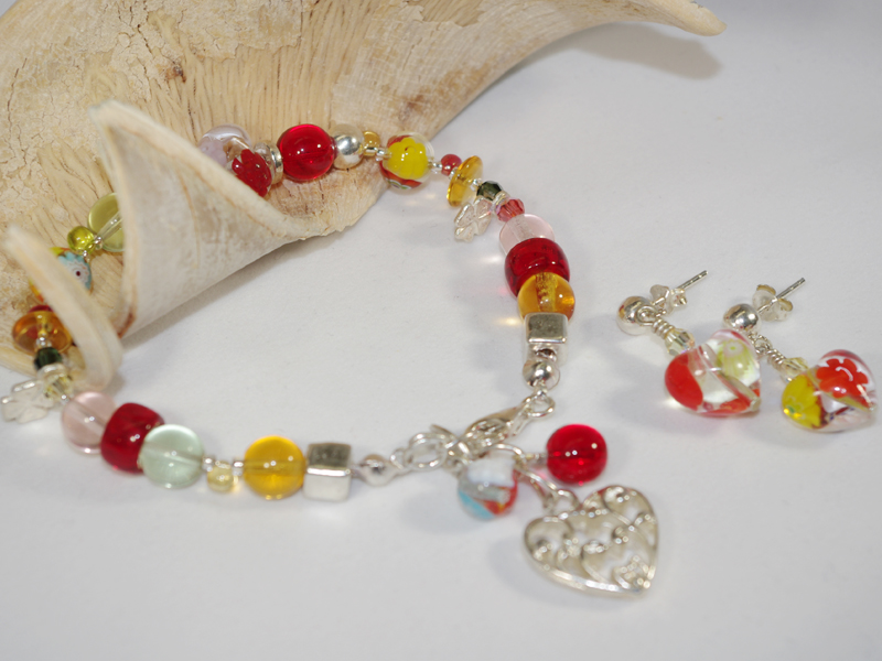 Klicken Sie auf die Bilder für eine DetailansichtVerarbeitete Materialien: Bunte Glasperlen, Swarovski Kristalle, hart versilberte Keramikelemente, Blumenperlen im Millefiori Design, Verschluss und Ohrstecker 925er Sterling Silber.