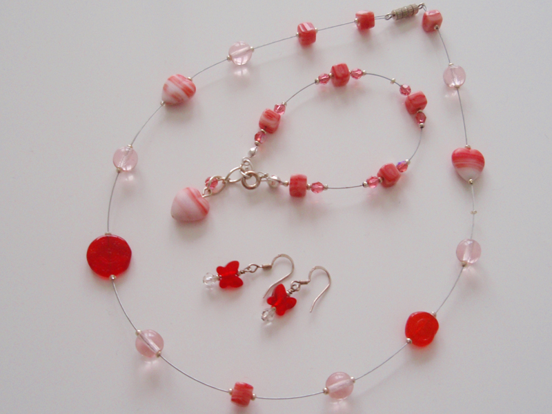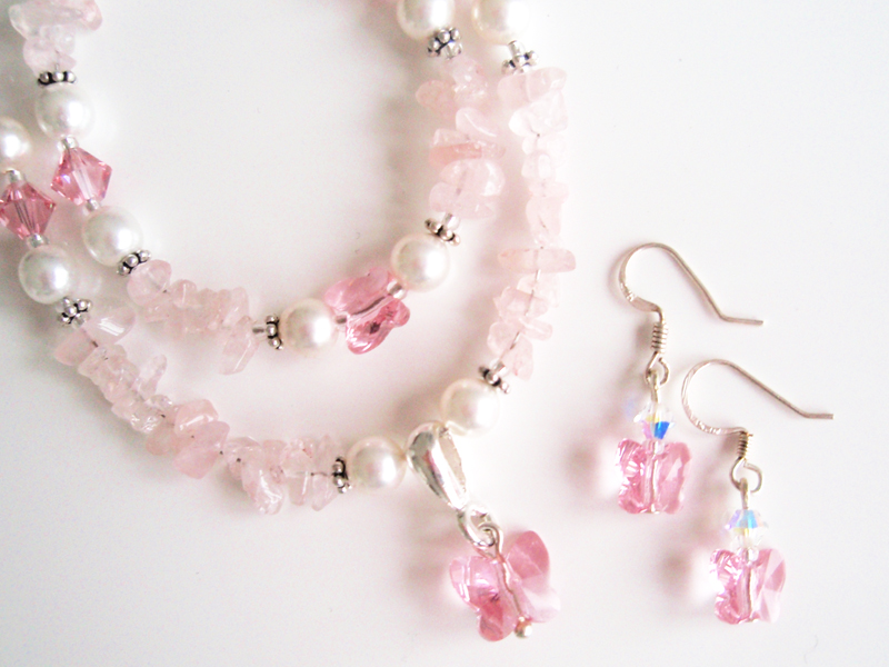 Verarbeitete Materialien: Swarovski Kristalle, Rosenquarz, Glaswachsperlen, Perlenkränze, Verschlüsse und Ohrringbügel aus 925er Sterling Silber.