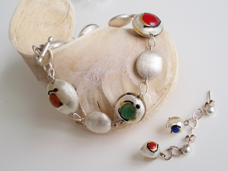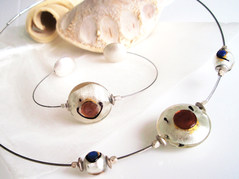 Verarbeitete Materialien: Wundervolle 20 mm Glasperlen in der Farbkomposition Miro-Multi mit Weißblattgold (Silber). Hochqualitative Glasperlen von Murano Glas hergestellt. Silberscheiben matt gebürstet mit Knebelverschluss.
