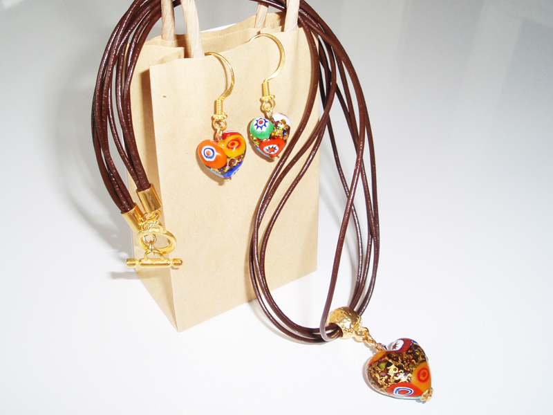 Verarbeitete Materialien: Murano Glasherz 20 mm Größe an vergoldeter Anhängerschlaufe mit Lederbändchen und vergoldetem Drehverschluss. Ohrring Bügel vergoldet und Murano Glas Babyherzen 13 mm Größe. Länge der Kette etwa 45 cm